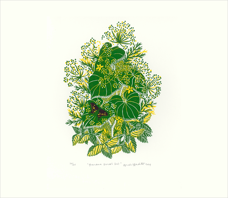 In partnership with the Seed Savers Exchange, an Iowa-based nonprofit that protects the biodiversity of our food system by preserving rare, heirloom, and open-pollinated varieties of seeds, I’ve created a limited-edition linocut print featuring a special heirloom herb: Grandma Einck’s Dill. The print, fittingly named Grandma Einck’s Dill, is for sale and half of its proceeds are being donated to Seed Savers Exchange to support their efforts to conserve unique seed varieties and build a “network of gardeners, farmers and educators committed to protecting our planet’s natural beauty and agricultural diversity.”