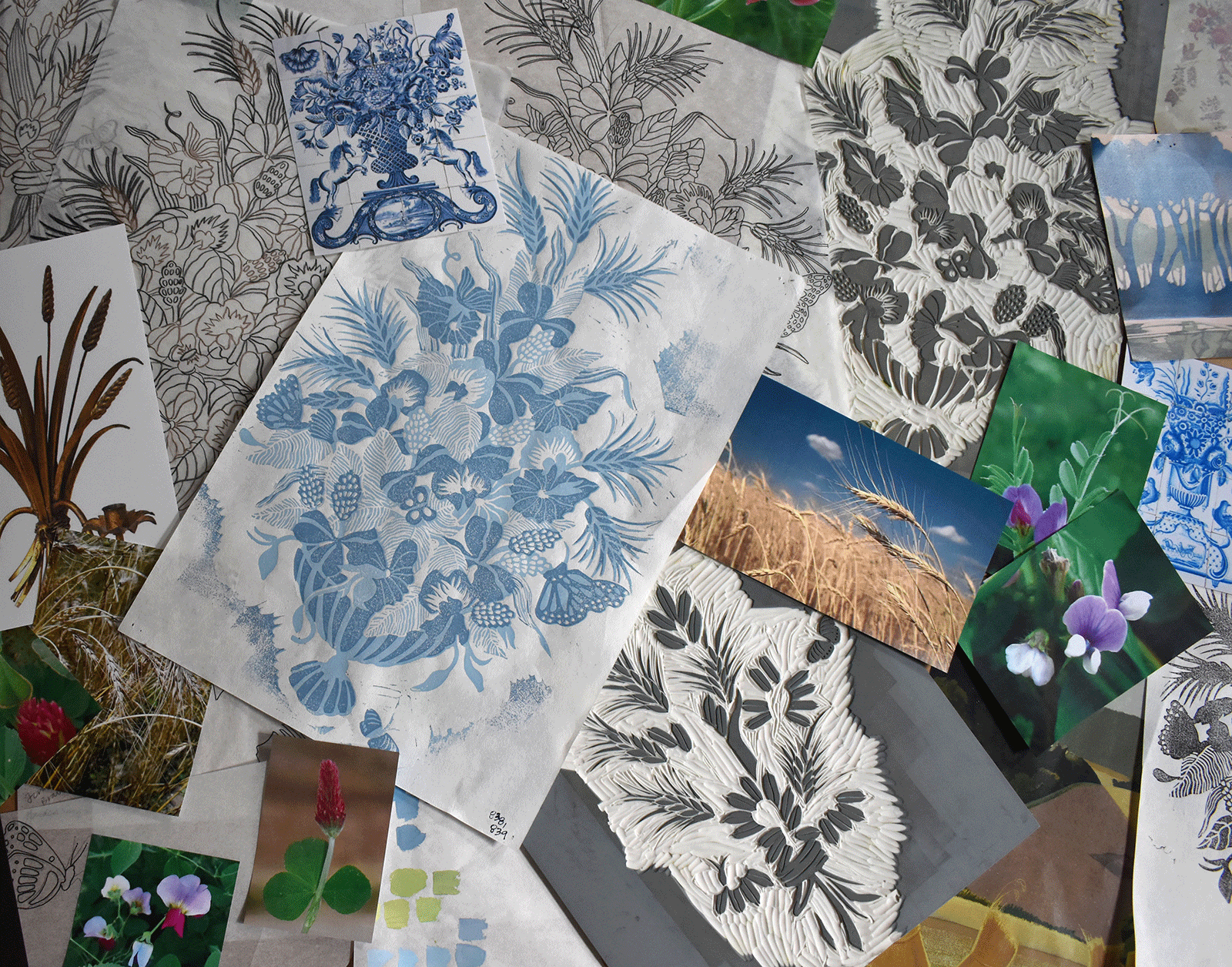 Next I sent the prints, along with an image of my initial sketch in repeat, to my wallpaper manufacturer in Connecticut where they were digitally printed as wallpaper on Forest Stewardship Council-certified clay coated paper. At this stage, the design received its final name. As Turkey Red wheat is planted in the autumn and known as a winter wheat variety, I named the pattern Winter Wheat. To order a sample of Winter Wheat wallpaper, please contact us directly or reach out to one of our showrooms.