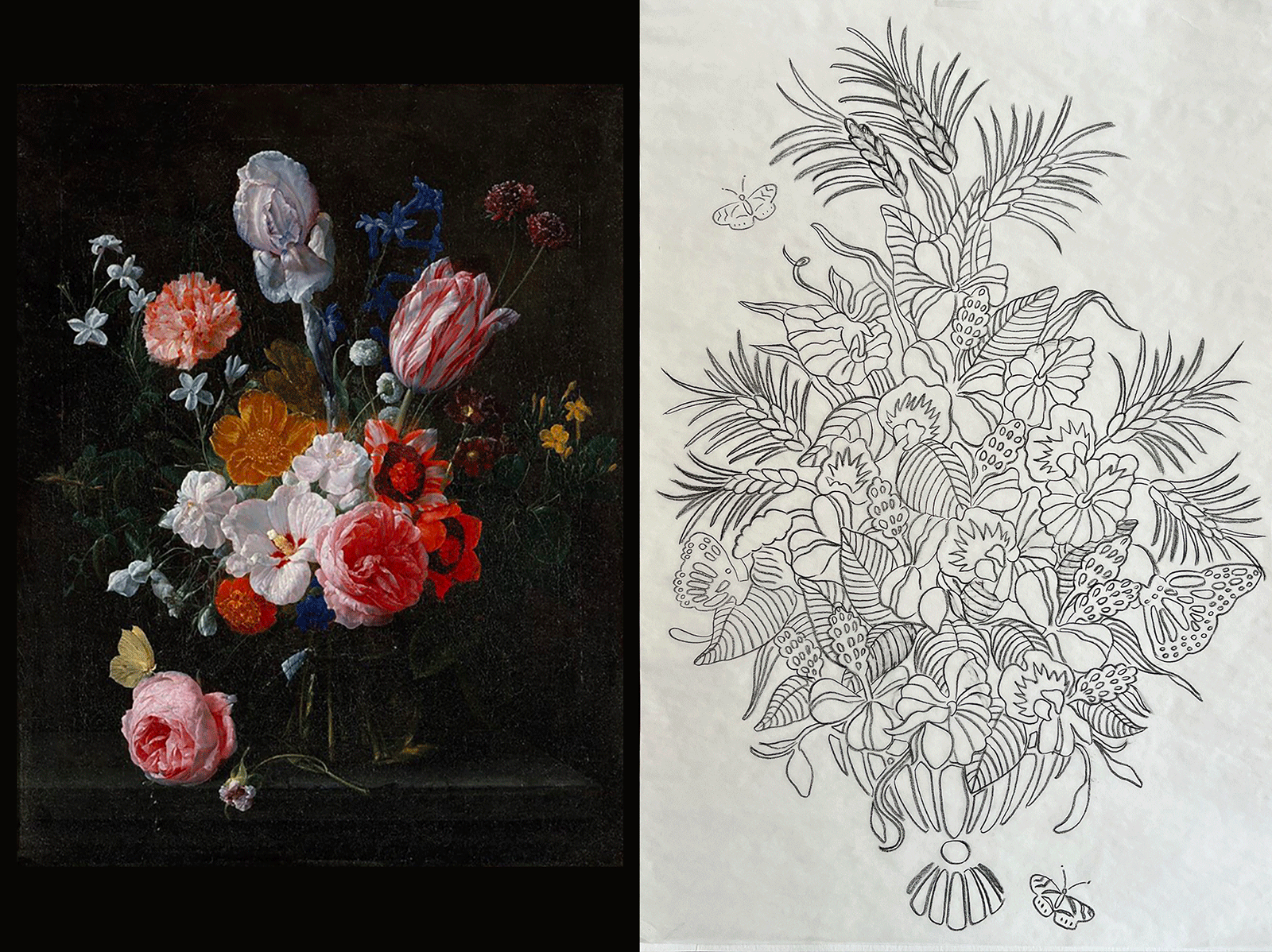 L: Bouquet of Flowers in a Crystal Vase by Nicolas Van Veerendael, 1662. Metropolitan Museum (public domain). R: Charcoal sketch for Winter Wheat.