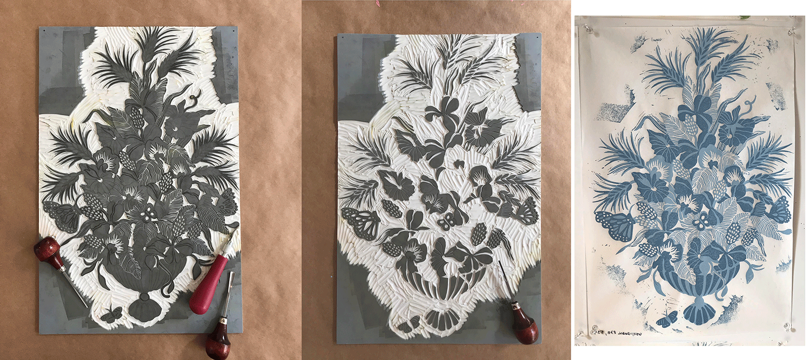Once I had completed drawing the motifs and resolving the pattern repeat, I transferred my sketches onto blocks: one block for light-colored motifs and one for dark. Next I carved the blocks and printed them. In the image above, the block on the left is printed first with light ink. The block on the right is printed next with dark ink. Registration must be perfect in order for the shapes to line up. The finished print is on the right.